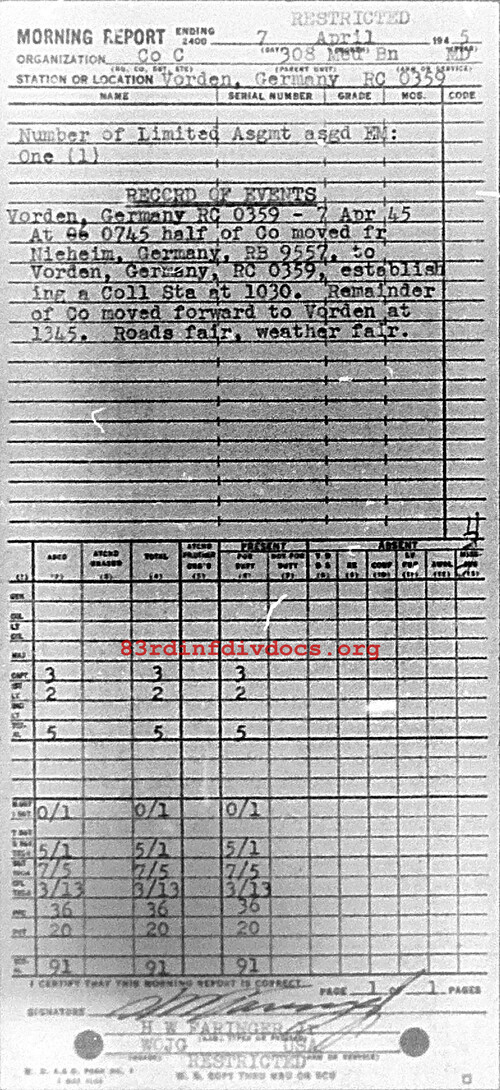At 0745 half of Co moved fr Nieheim, Germany, rB9557, to Vorden, Germany, rC0359, establishing a Coll Sta at 1030. Remained of Co moved forward to Vorden at 1345. Roads: Fair. Weather: Fair.
