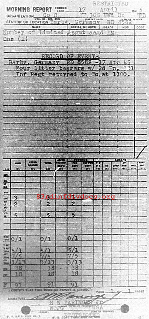 Four litter bearers w/ 2nd Bn, 331 Inf Regt returned to Co at 1100.