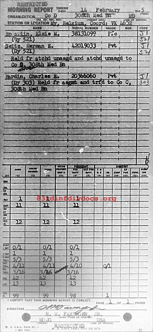 Morning report D/308M for February 14, 1945
