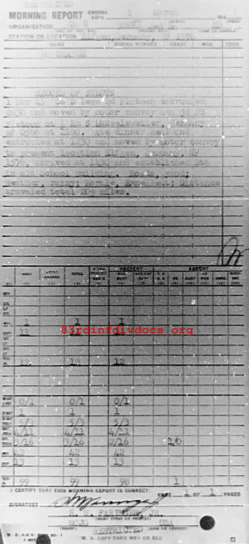 Co D less 2d Platoon entrucked 0830 and moved by motor convoy and jd 2d Platoon at 1/2 Km S Hasselsweiler, Germany, wF0566 at 1100. At dinner meal and entrucked at 1230 and moved by motor convoy to present location, Elfgen, Germany, wF1576, arrived at 1430 and established Sta in old School Building. Roads: Good. Weather: Rainy. Morale: Excellent. Distance traveled: Total 20 1/2 miles.