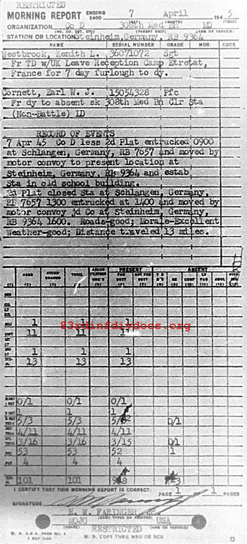 Co D less 2d Plat entrucked 0900 at Schlangen, Germany, rB7657 and moved by motor convoy to present location at Steinheim, Germany, rB9364 and estab Sta in old school building. 2d Plat closed Sta at Schlangen, Germany, rB7657 1300 entrucked at 1400 and moved by motor convoy joined Co at Steinheim, Germany, rB9364 1600. Roads: Good. Morale: Excellent. Weather: Good. Distance traveled: 13 miles.