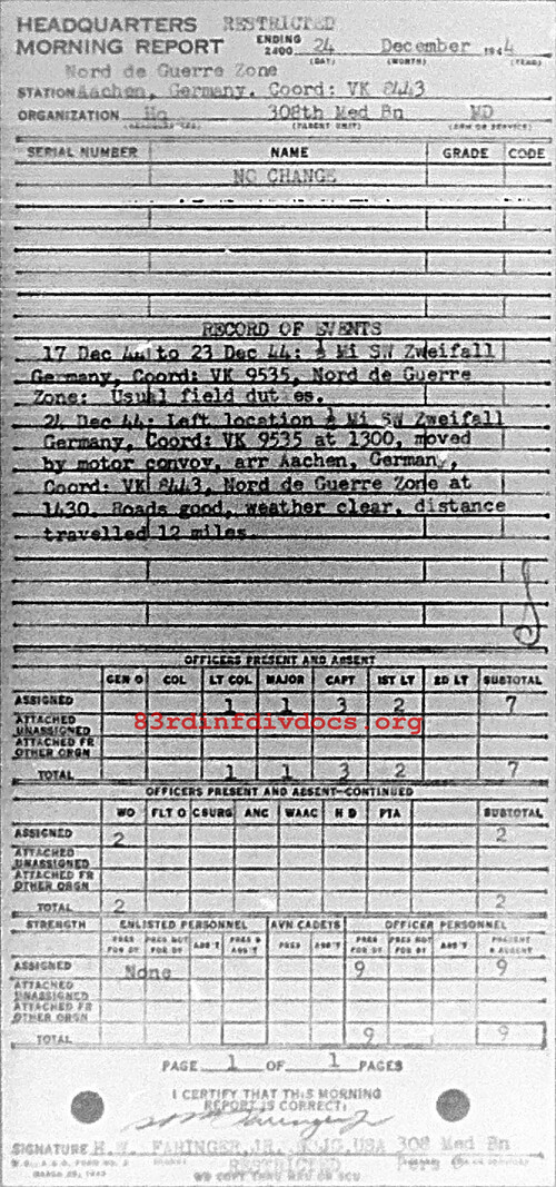 Morning report HQ/308M for December 24, 1944