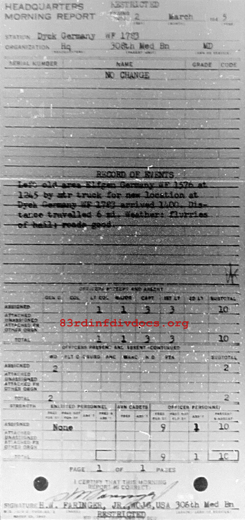 Morning report HQ/308M for March 2, 1945