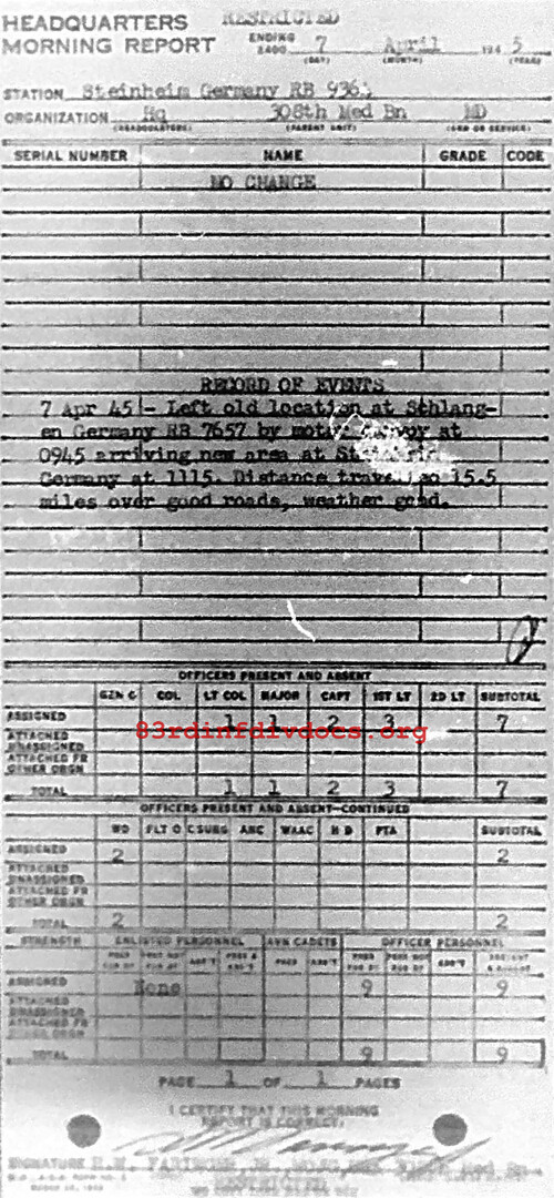 Left old location at Schlangen, Germany, rB7657, by motor convoy at 0945 arriving new area at Steinheim, Germany at 1115. Distance traveled: 15.5 miles over good roads. Weather: Good.