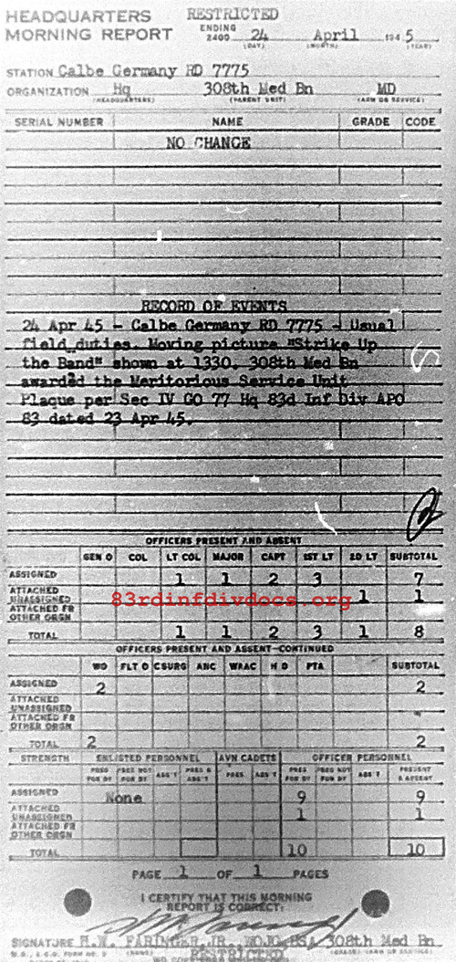 Usual field duties. Moving picture 'Strike Up the Band' shown at 1300. 308th Med Bn awarded the Meritorious Service Unit Plaque per Sec IV GO 77, Hq 83d Inf Div APO 83 dated 23 Apr 45.