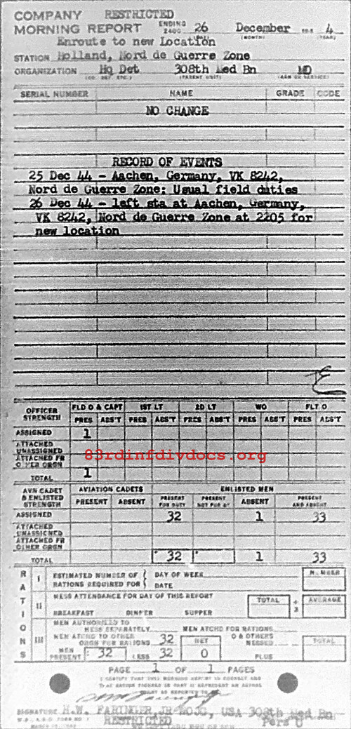 25 Dec 44: Aachen, Germany, vK8242, NdG Zone: Usual field duties. 26 Dec 44: Left sta at Aachen, Germany, vK8242, NdG Zone at 2205 for new location