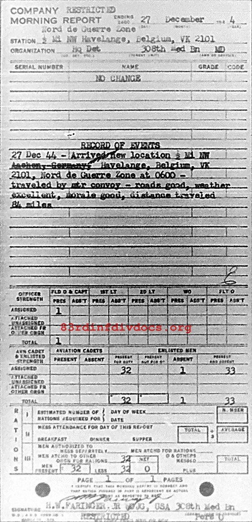 Arrived new location 1/2 Mi NW Havelange, Belgium, vK2101, NdG Zone at 0600. Traveled by mtr convoy. Roads: Good. Weather: Excellent. Morale: Good. Distance traveled: 84 miles.