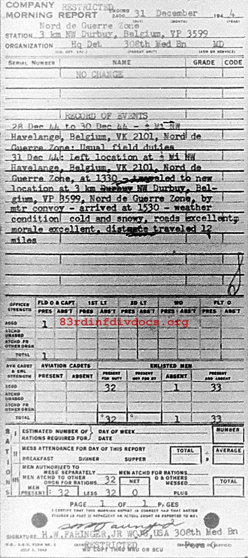 28 Dec 44 to 30 Dec 44: 1/2 Mi NW Havelange, Belgium, vK2101 NdG Zone: Usual field duties. 31 Dec 44: Left location at 1/2 Mi NW Havelange, Belgium, vK2101, NdG Zone at 1330 to new location at 3 km NW Durbuy, Belgium, vP3599, NdG Zone, arrived at 1530. Weather: Cold and snowy. Roads: Excellent. Morale: Excellent. Distance traveled: 12 miles.