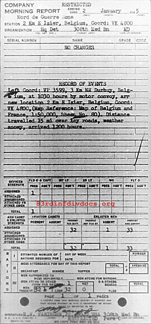 Left location 3 Km NW Durbuy, Belgium, coord vP3599 by motor convoy 1020, arr new location 2 Km E Izier, Belgium, coord vK4800. Distance traveled 15 miles over icy roads. Weather: Snowy, arrived 1200 hours.