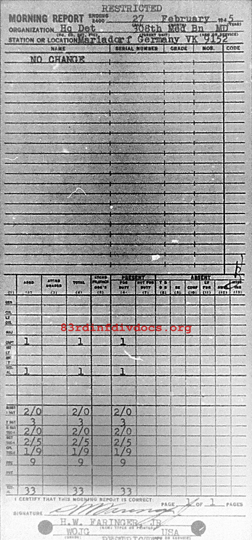 Morning report HQDET/308M for February 27, 1945