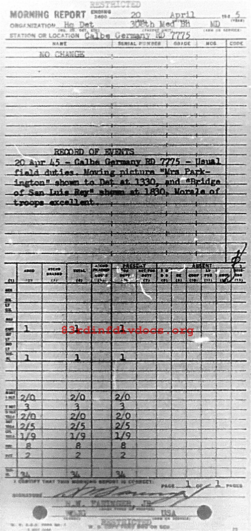 Usual field duties. Moving picture 'Mrs Parkington' shown to DEt at 1330, and 'Bridge of San Luis Rey' shown at 1830. Morale of troops: Excellent.