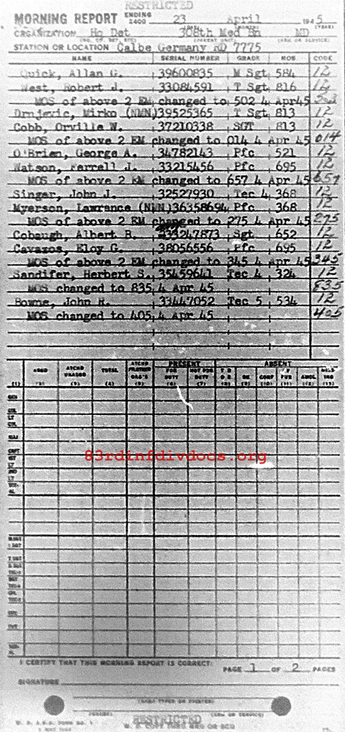 Morning report HQDET/308M for April 23, 1945