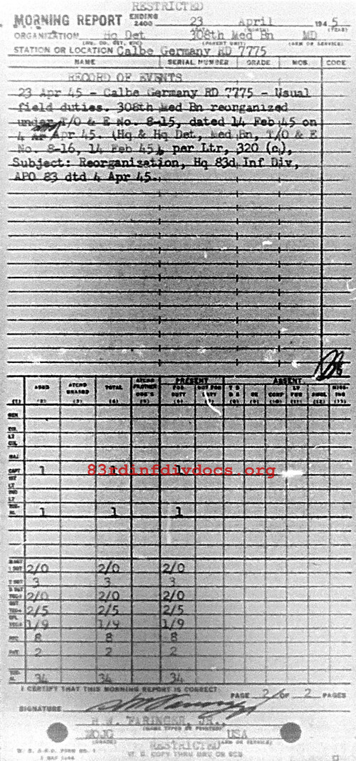 Usual field duties. 308th Med Bn reorganized under T/O & E No 8-15, dated 14 Feb 45 on 4 Apr 45. (Hq & Hq Det, Med Bn, T/O & E No. 8-16, 14 Feb 45), per Ltr, 320 (c) Sub: Reorganization, Hq 83d Inf Div APO 83, dtd 4 Apr 45.
