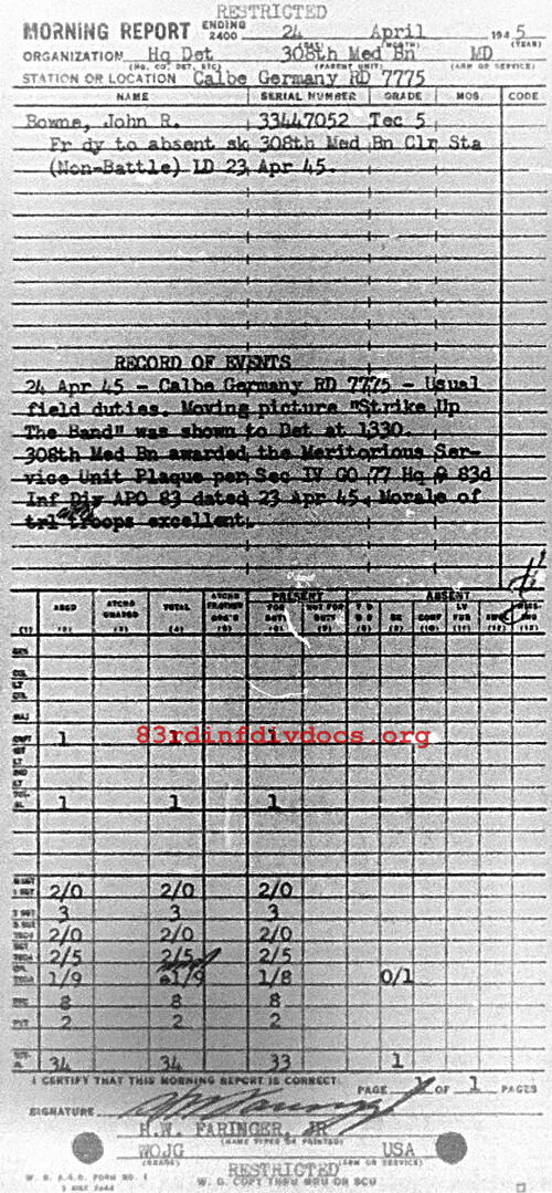 Usual field duties. Moving picture 'Strike Up the Band' shown to Det at 1300. 308th Med Bn awarded the Meritorious Service Unit Plaque per Sec IV GO 77, Hq 83d Inf Div APO 83 dated 23 Apr 45. Morale of the troops: Excellent.