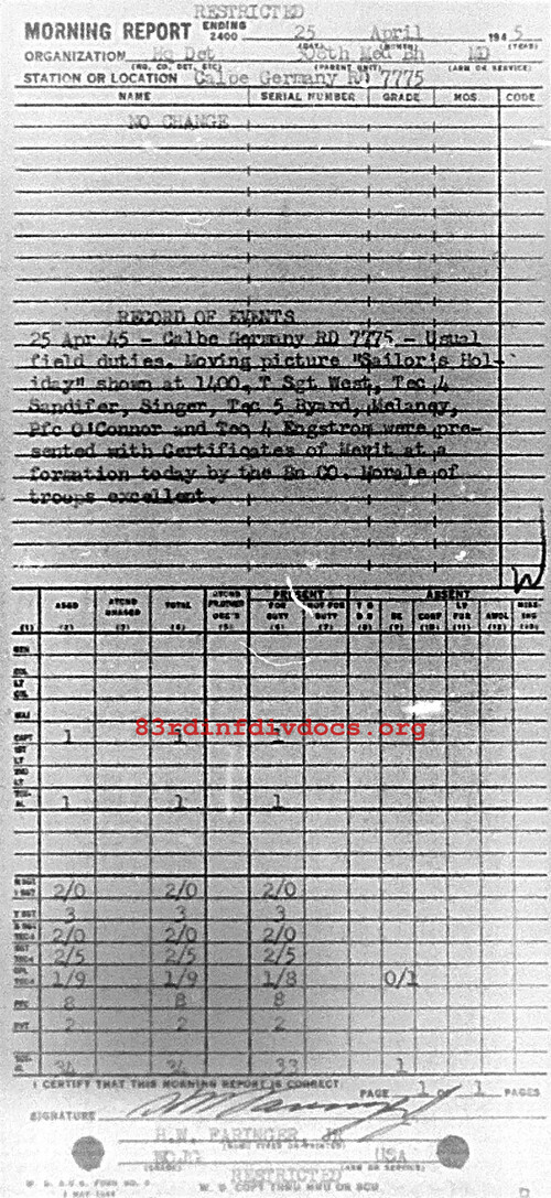 Usual field duties. Moving picture "Sailor's Holiday" shown at 1400, T/Sgt West, Tec4 Sandifer, Singer, Tec5 Byard, Melany, Pfc O'Connor and Tec4 Engstrom were presented with Certificate of Merit at a formation today by the Bn CO. Morale of troops: Excellent.