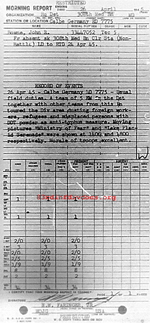 Morning report HQDET/308M for April 26, 1945
