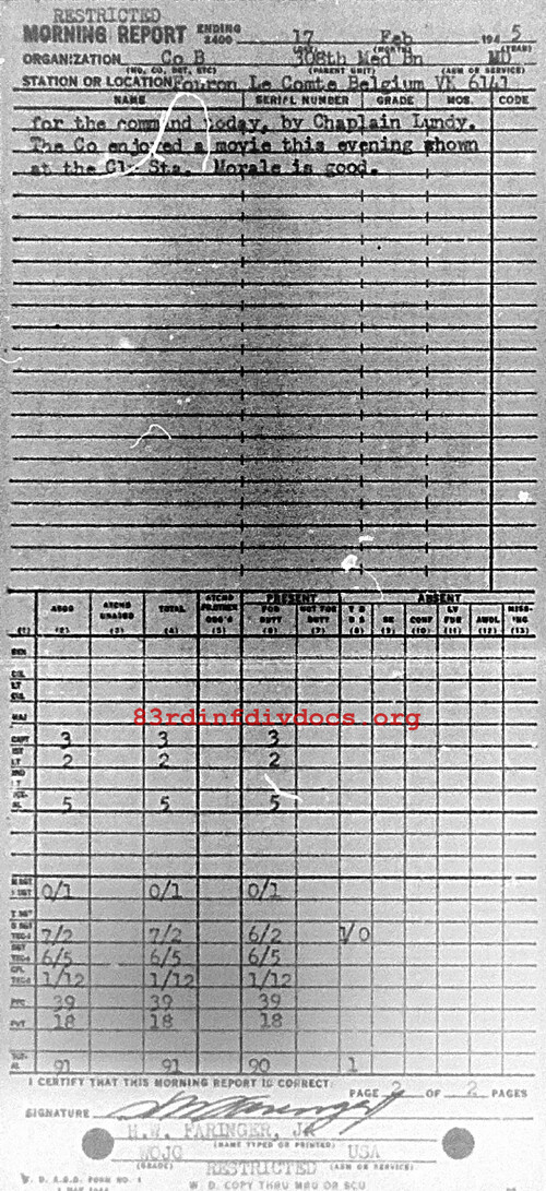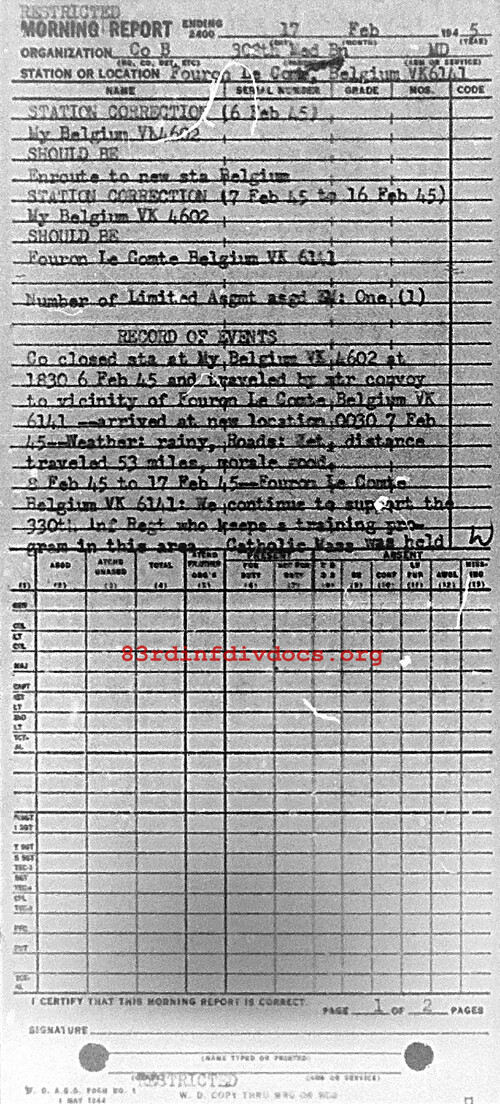Co closed station at Ny, Belgium. vK4602 at 1830 6 Feb 45 and traveled by motor convoy to vicinity of Fouron Le Comte, Belgium, vK6141. Arrived at new location 0030 7 Feb 45. Weather: Rainy. Roads: Wet: Distance traveled: 53 miles. Morale: Good. 8 Feb 45 to 17 Feb 45: We continue to support the 330th Inf Regt, who keeps a training program in this area. Catholic Mass was held for the command today, by Chaplain Lundy. To Co enjoyed a movie this evening shown at the Clearing Station. Morale is good.
