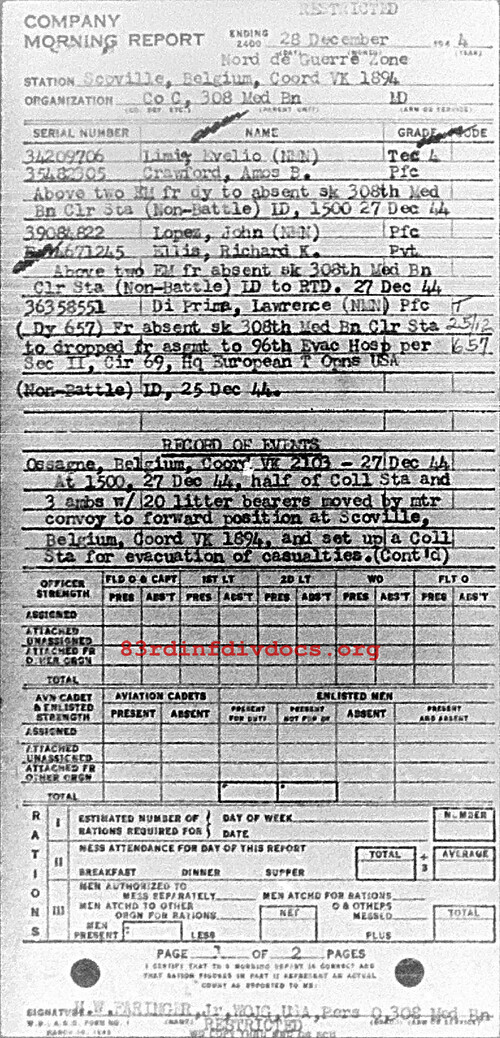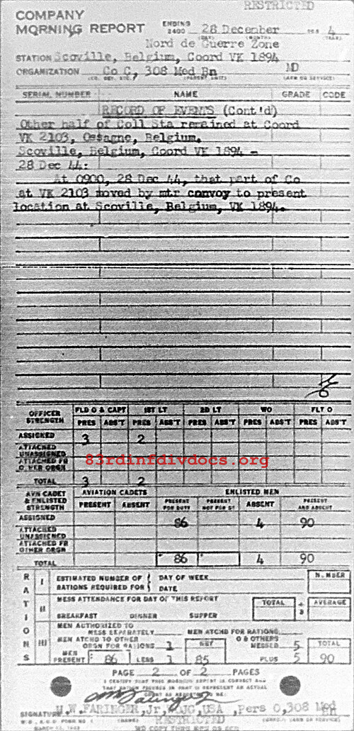 27 Dec 44: At 1500, 27 Dec 44, half of Collection Station and 3 ambulances with 20 litter bearers moved by motor convoy to forward position at Scoville, Belgium, coord: vK1894, and setup a Collection Station for evacuation of casualties. Other half of Collection Station received at coord: vK2103, Ossagne, Belgium. 28 Dec 44: At 0900, 28 Dec 44, that part of Co at vK2103 moved by motor convoy to present location at Scoville, Belgium, vK1894.