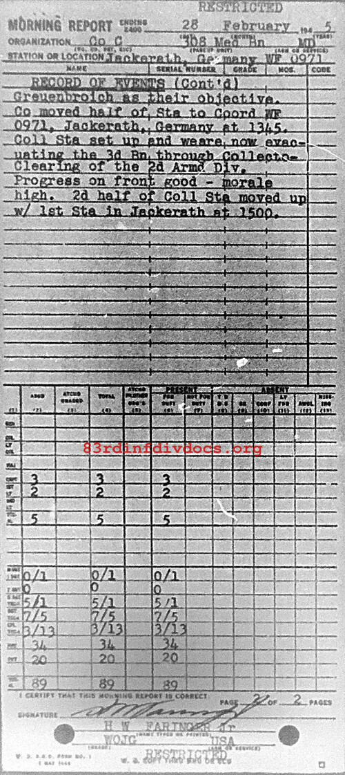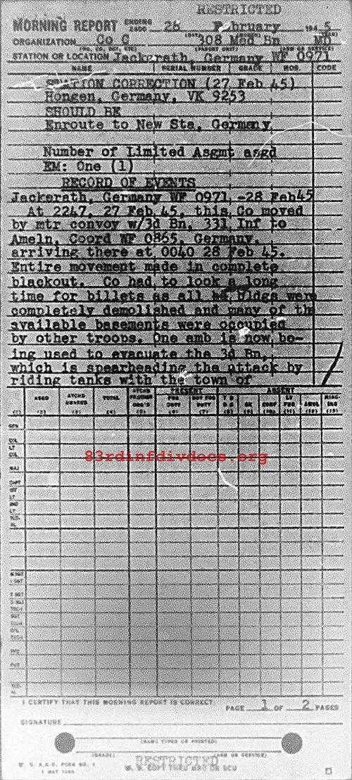 At 2247, 27 Feb 45, this Co moved by motor convoy with 3d Bn, 331 Inf to Ameln, wF0865, Germany, arriving there at 0040 28 Feb 45. Entire movement made in complete blackout. Co had to look for a long time for billets as all bldgs were comppletely demolished and many of the available basements were occupied by other troops. One ambulance is now being used to evacuate the 3d Bn which is spearheading the attack by riding tanks with the town of Greuenbroich as their objective. Co moved half of Station to wF0971, Jackerath, Germany 1345. Collection Station set up and we are now evacuating the 3d Bn, through Collection to Clearing of the 2d Armd Div. Progress on front good. Morale: High. 2d half of Collection Station moved up with 1st Station in Jackerath at 1500.