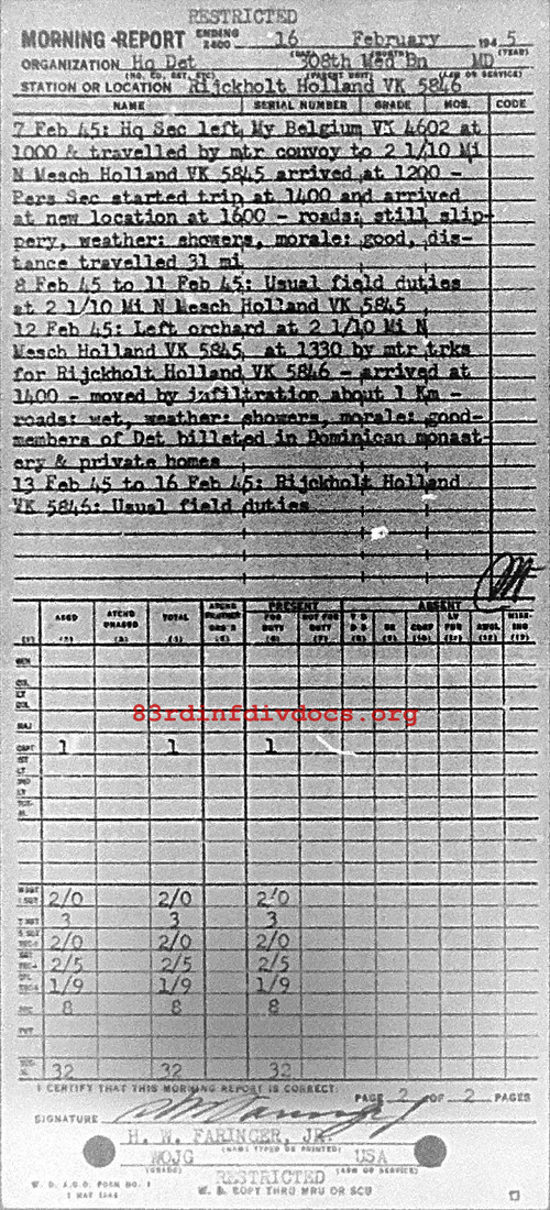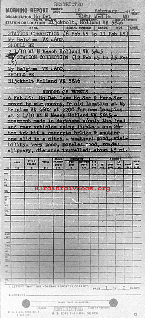 6 Feb 45: Hq Det less Hq Sec & Pers Sec moved by mtr convoy fr old location at My, Belgium, vK4602 at 2200 for new location at 2 1/10 Mi N Mesch, Holland, vK5845. Movement made in darkness with only the lead and rear vehicles using lights. One 2 1/2 ton trk hit a concrete bridge and another one slid in a ditch. Weather: Good. Visibility: Very poor. Morale: Good. Roads: Slippery. Distance traveled: About 45 miles. 7 Feb 45: Hq Sec left, My, Belgium, vK4602 at 1000 and traveled by mtr convoy to 2 1/10 Mi N Mesch, Holland, vK5845 arrived at 1200. Pers Sec started trip at 1400 and arrived at new location at 1600. Roads: Still slippery. Weather: Showers. Morale: Good. Distance traveled: 31 miles. 8 Feb 45 to 11 Feb 45: Usual field duties at 2 1/10 Mi N Mesch, Holland, vK5845. 12 Feb 45: Left orchard at 2 1/10 Mi N Mesch, Holland, vK5845, at 1330 by mtr trks for Rijckholt, Holland, vK5846, arrived at 1400. Moved by infiltration about 1 Km. Roads: Wet. Weather: Showers. Morale: Good. Members of Det billeted in Dominican Monastery and private homes. 13 Feb 45 to 16 Feb 45: Rijckholt, Holland, vK5845. Usual field duties