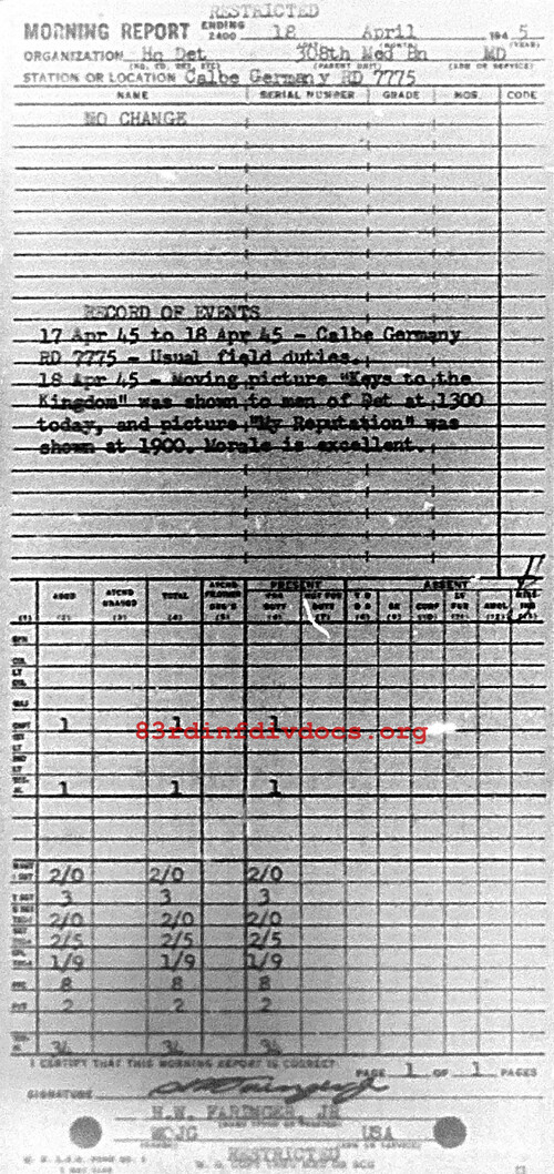 Morning report HQDET/308M for April 18, 1945