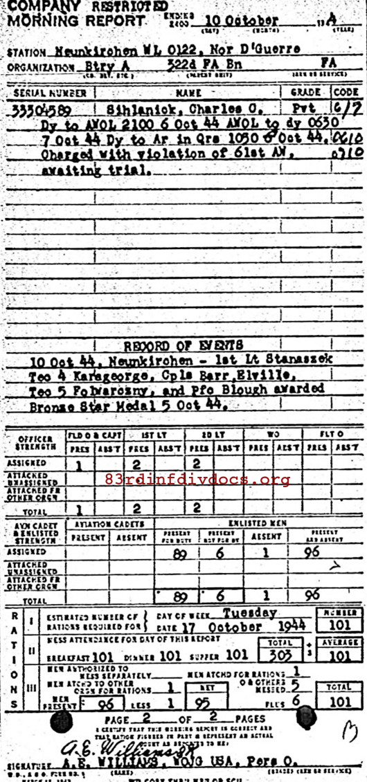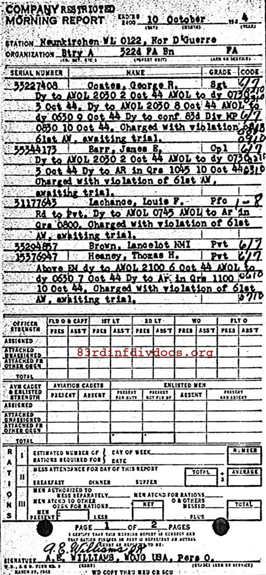 Morning report A/322FA for October 10, 1944