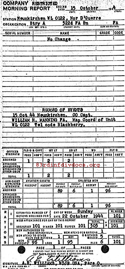 CO Capt William H Manning FA. Map coord of unit WL0122. Tel code Blackberry