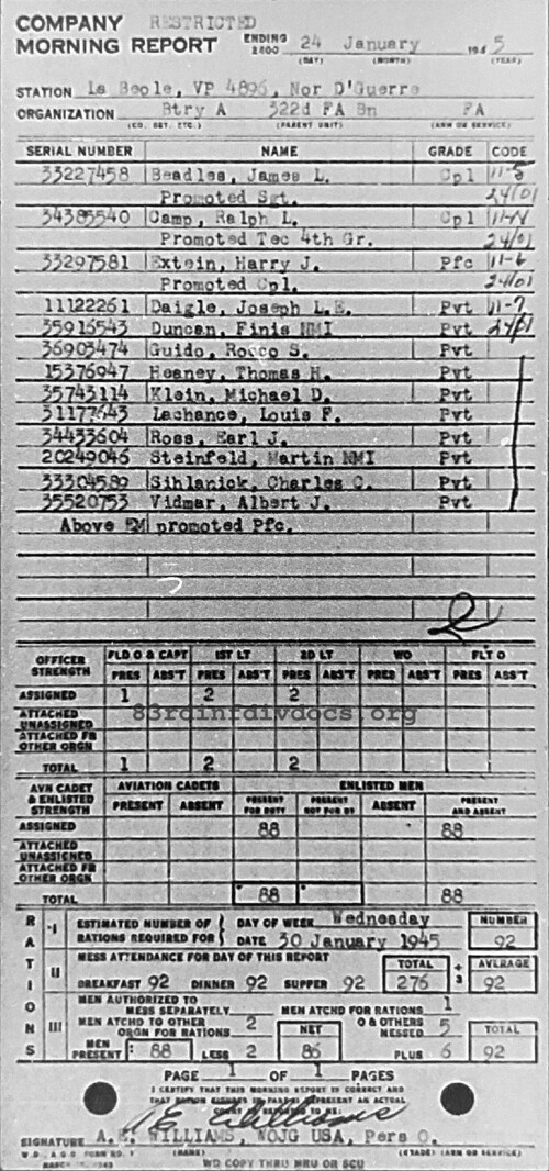 Morning report A/322FA for January 24, 1945