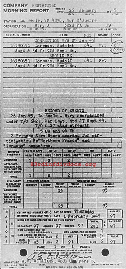 Btry reorganized under T/O 6-27, War Dept, dtd 27 Sept 44. T/O 6-27 atzd strenght, 5 Os and 94 EM. 2 Bronze Service Stars awarded for participation in 'Northern France' and 'Germany' campaigns.