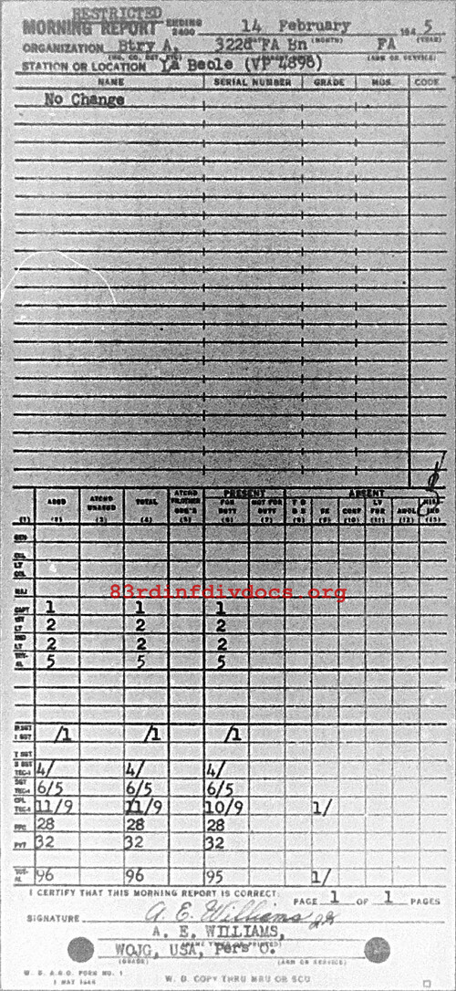 Morning report A/322FA for February 14, 1945