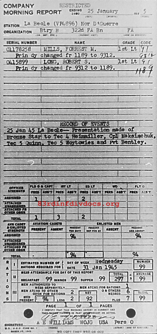 Presentation made of Bronze Star to Tec4 Heinmiller, Cpl Maksimchuck, Tec5 Quinn, Tec5 Woytowiez and Pvt Bentley.