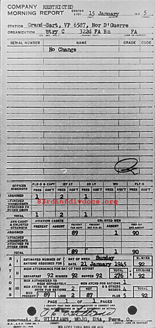 Morning report C/322FA for January 15, 1945