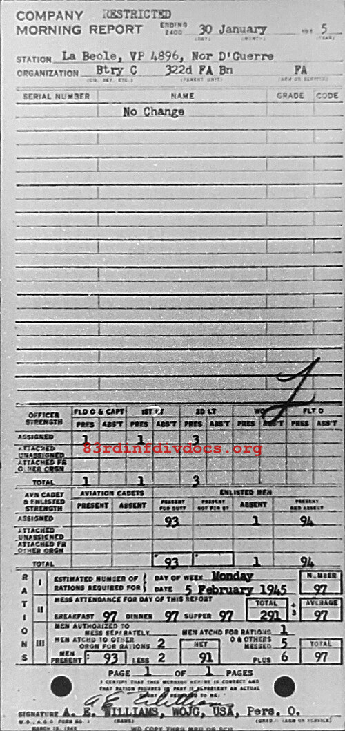 Morning report C/322FA for January 30, 1945