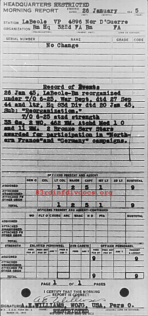 Morning report HQ/322FA for January 26, 1945