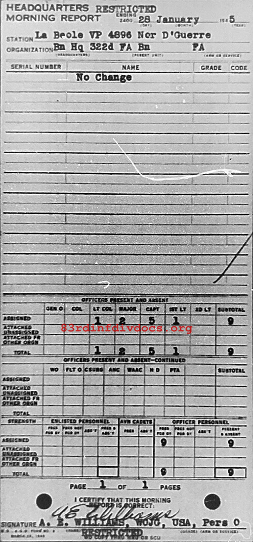 Morning report HQ/322FA for January 28, 1945