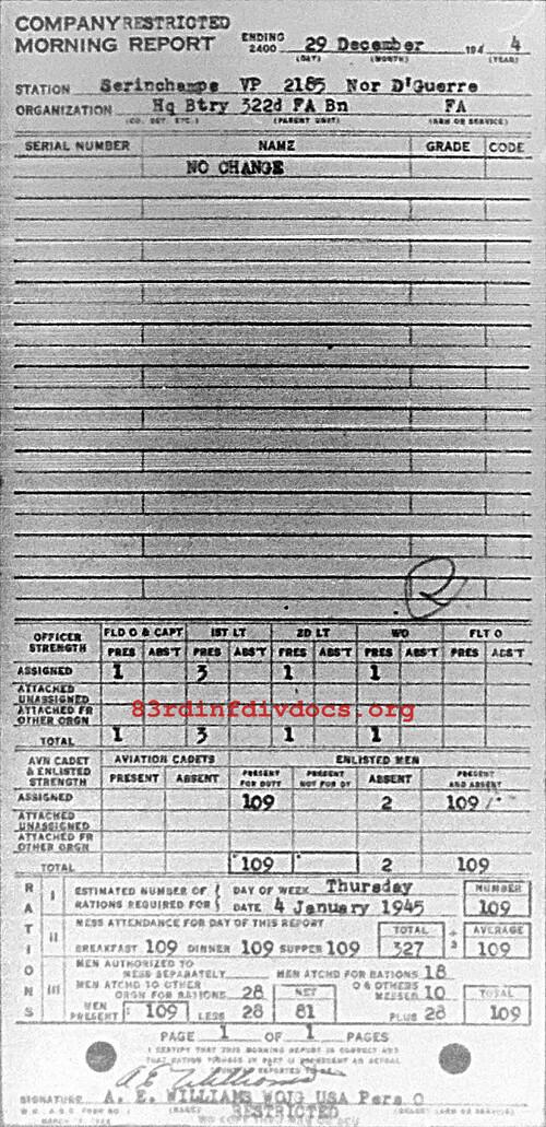 Morning report HQBTRY/322FA for December 29, 1944
