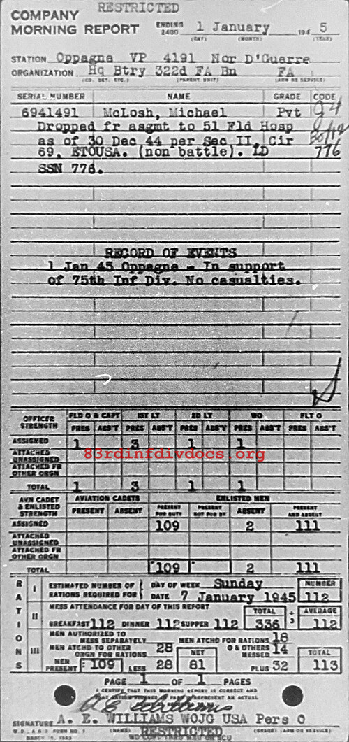 Morning report HQBTRY/322FA for January 1, 1945