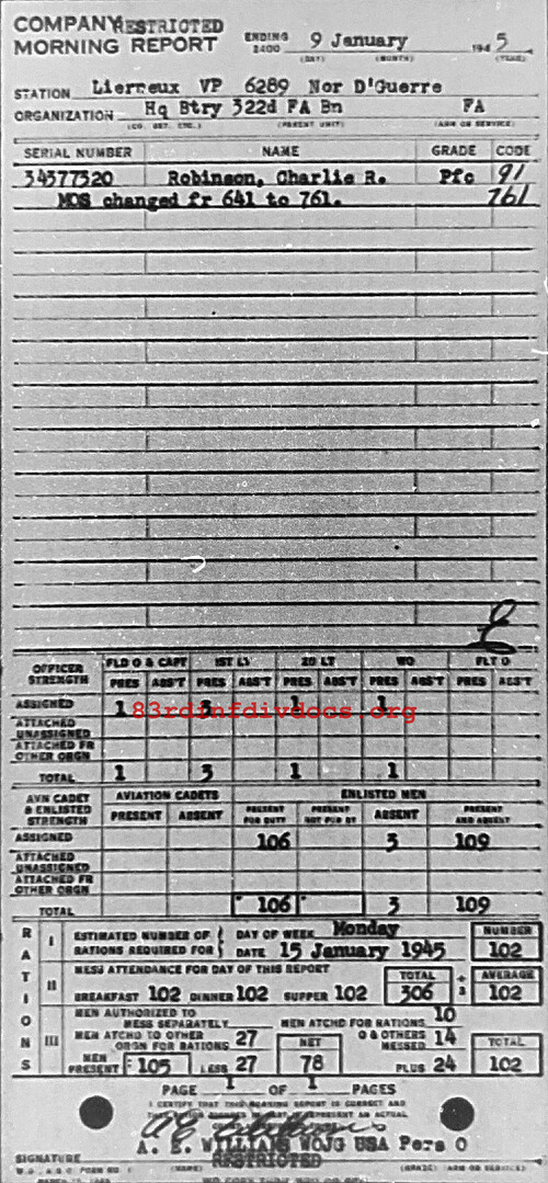 Morning report HQBTRY/322FA for January 9, 1945