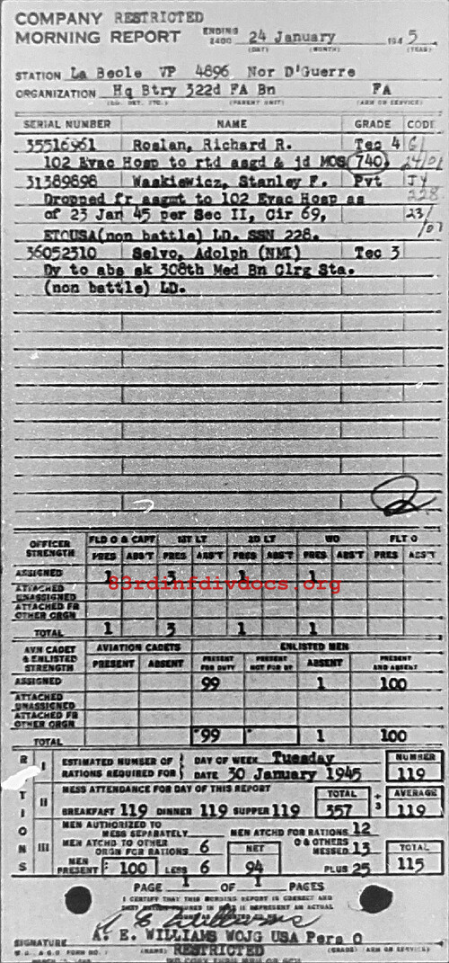 Morning report HQBTRY/322FA for January 24, 1945