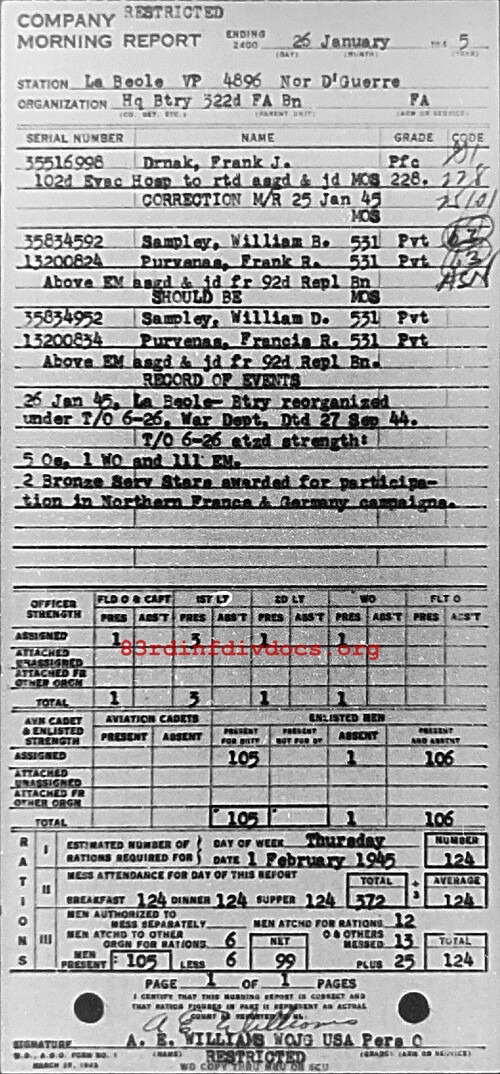 Morning report HQBTRY/322FA for January 26, 1945