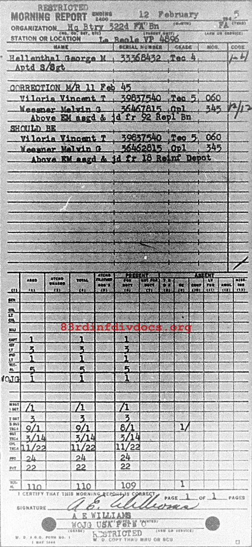 Morning report HQBTRY/322FA for February 12, 1945