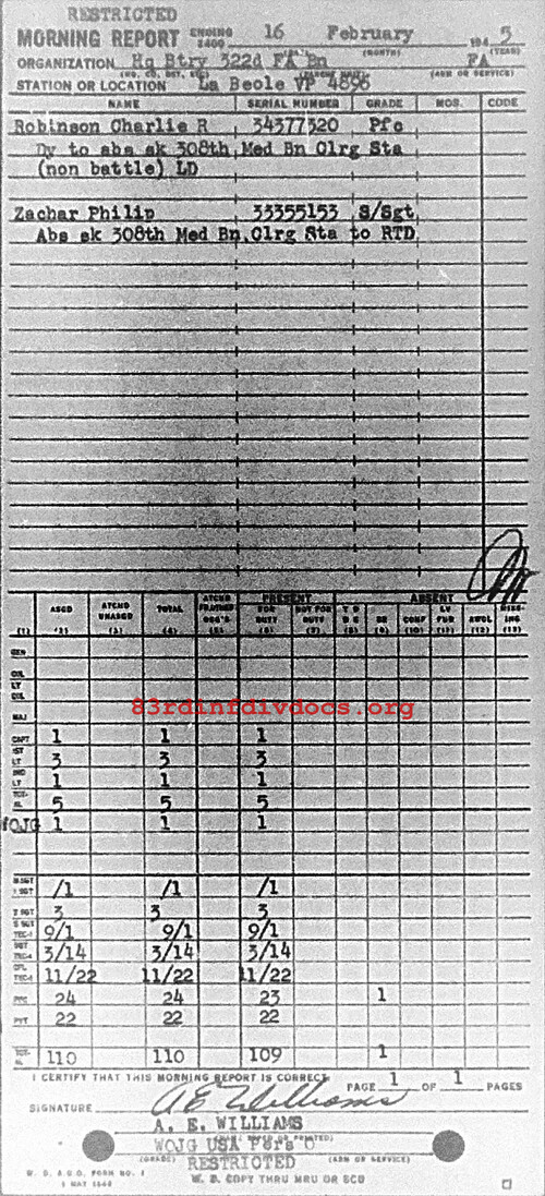Morning report HQBTRY/322FA for February 16, 1945