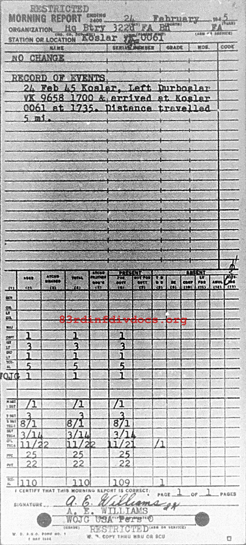 Morning report HQBTRY/322FA for February 24, 1945