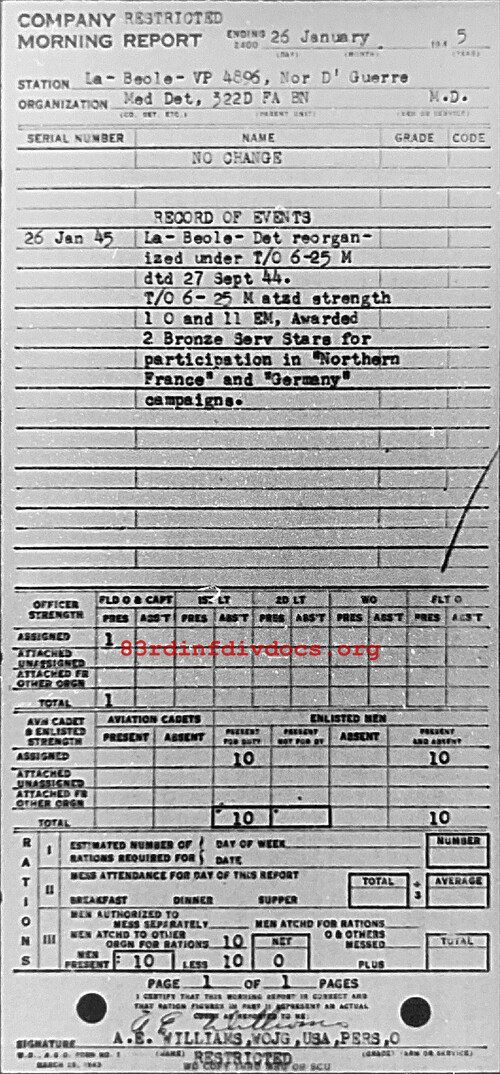 Det reorganized under T/O 6-25 M, dtd 27 Sep 44. T/O 6-25 atzd strenght 1 O and 11 EM. 2 Bronze Serv Stars awarded for participation in 'Northern France' and 'Germany' campaigns.
