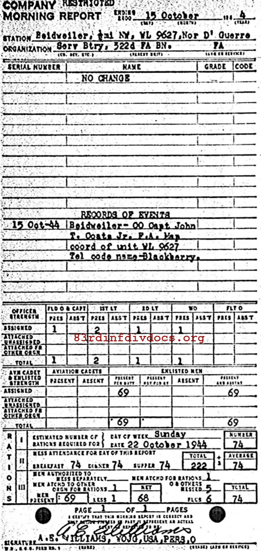 CO Capt John T Coats Jr, F.A. Map coord of unit wL9626. Tel code name - Blackberry