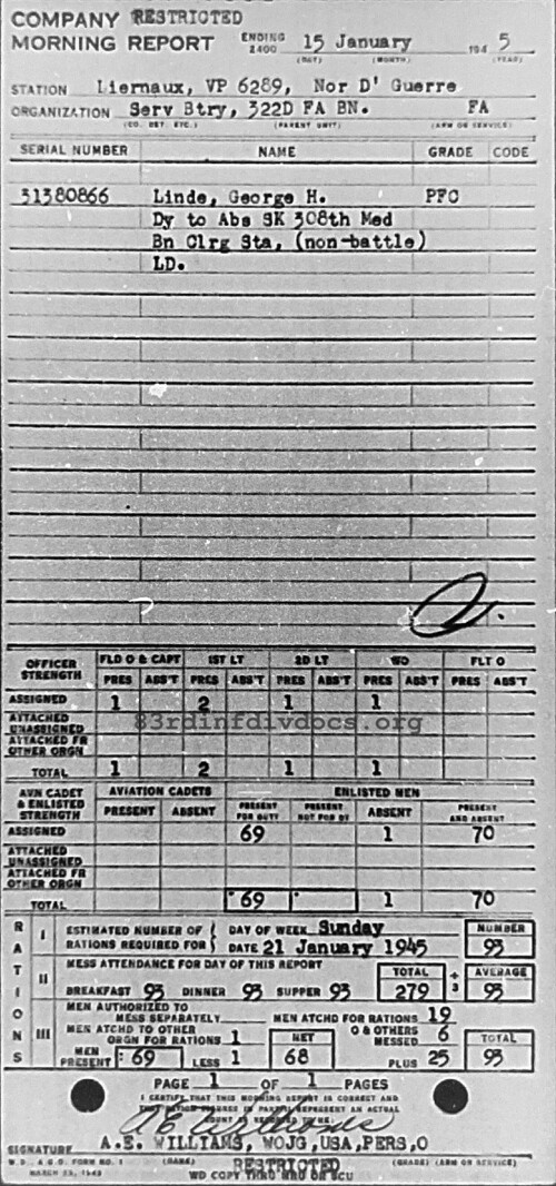 Morning report SERBTRY/322FA for January 15, 1945