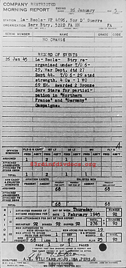 Morning report SERBTRY/322FA for January 26, 1945