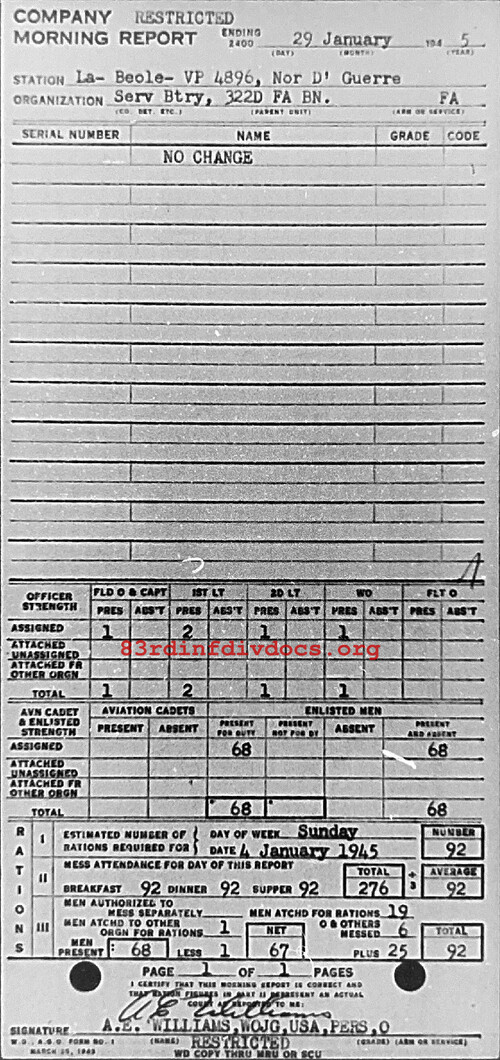 Morning report SERBTRY/322FA for January 29, 1945