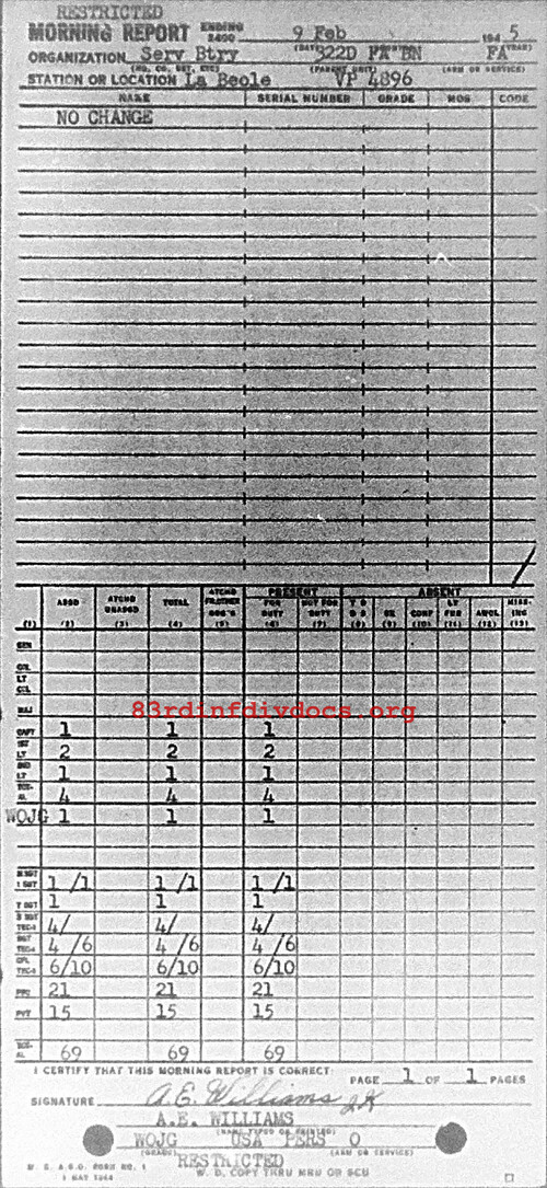 Morning report SERBTRY/322FA for February 9, 1945