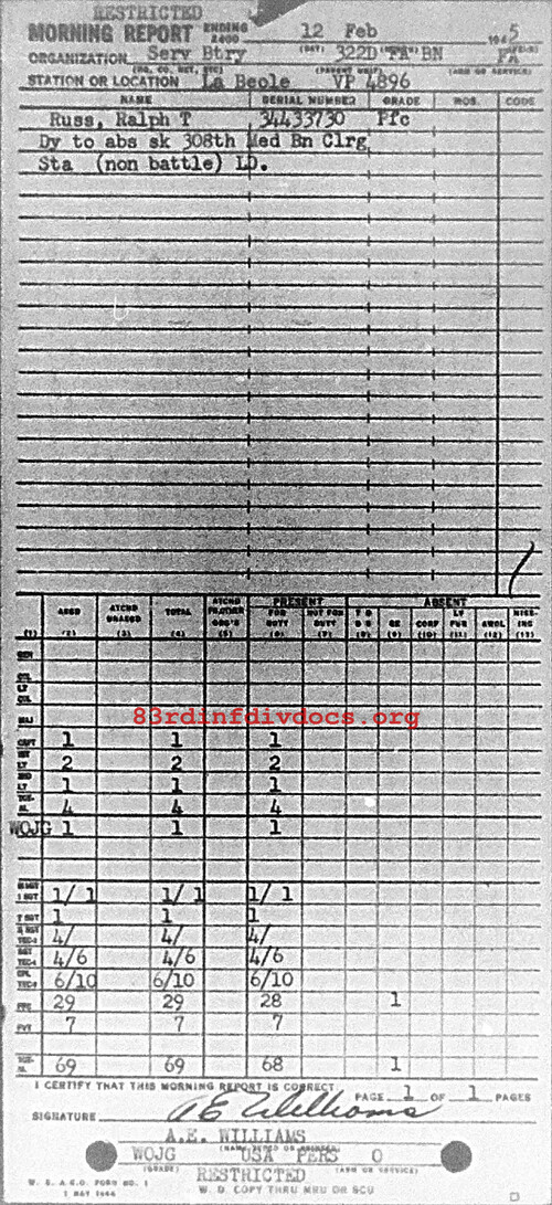 Morning report SERBTRY/322FA for February 12, 1945